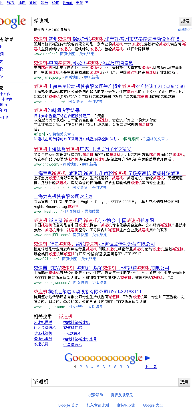谷歌搜索引擎對本公司網站的收錄做瞭更新,輸入“減速機”,現在排名第八位,位於首頁下方。
