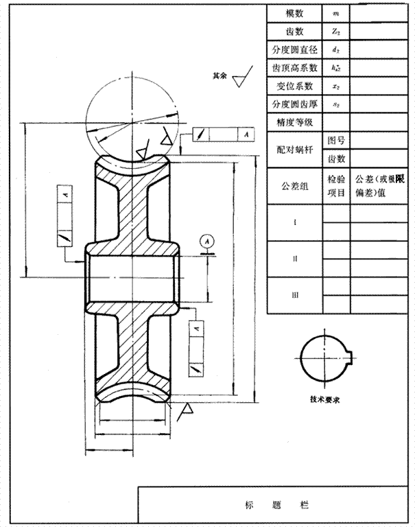 蝸杆、蝸輪圖樣的繪制應符合GB4459.2的規定。圖樣中的參數表一般放置於(yú)圖面的右上方 ,參數表中列出的數據項目可根據需要增減,檢驗項目則按使用要求和用戶意見根據GB10089和有關标準的規定確(què)定。圖樣的技術要求一般放置於(yú)圖面的右下方。