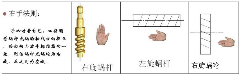 蝸輪蝸杆旋向是蝸輪蝸杆傳動的基本參數,分左旋和右旋,主要區别在於蝸輪蝸杆的旋轉方向 ,其中右旋蝸杆最爲常見 ,一副蝸輪蝸杆旋向的判斷方法可根據右手法則確認: