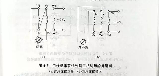 先用萬用表将繞組的6根引線分成3個獨立繞組,然後按圖4-7所示的接法通以低壓交流電(diàn)源(所加電(diàn)壓應使繞組中的電(diàn)流不超過額定值)。如果燈(dēng)泡發亮,則說明串聯的U、V兩相繞組是正向串聯。即一相繞組的首端接另一相繞組的尾端,如圖4-7(a)所示。如果燈(dēng)泡不亮,則說明是反向串聯,如圖4-7(b)所示 。這時,可将一相繞組的首尾端對調再試。判斷出前兩相的首尾端後,将其中一相再與第三相串聯,用同樣方法實驗。最後,可以判斷出三相繞組各自的首尾端 。