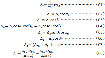 C2齒輪各項誤差應按下述規定的方向計值 :Δfpb、ΔFb、ΔFpX、Δffβ、ΔFw、ΔEwm、jn在齒面法線方向計值;ΔFi′、Δfi′、ΔFp、ΔFpk、Δfpt、ΔFβ、ΔFic′、Δfic′、jt在分度圓切線方向計值;Δff在基圓切線方向計值;ΔFr、ΔFi″、Δfi″、ΔEα″和ΔEH在雙側齒面徑向計值;ΔEs在雙側齒面分度圓螺旋線的法線方向計值。