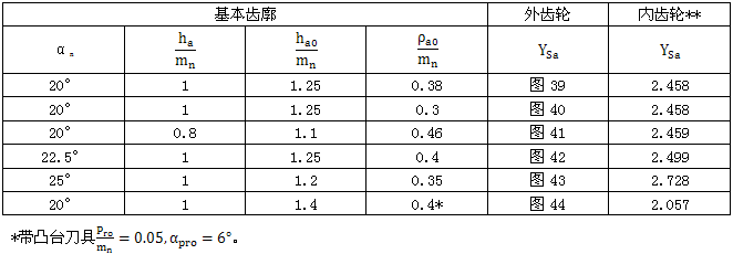 與圖39至44各齒形參數相應的内齒輪應力修正系YSa也可由表20查取。