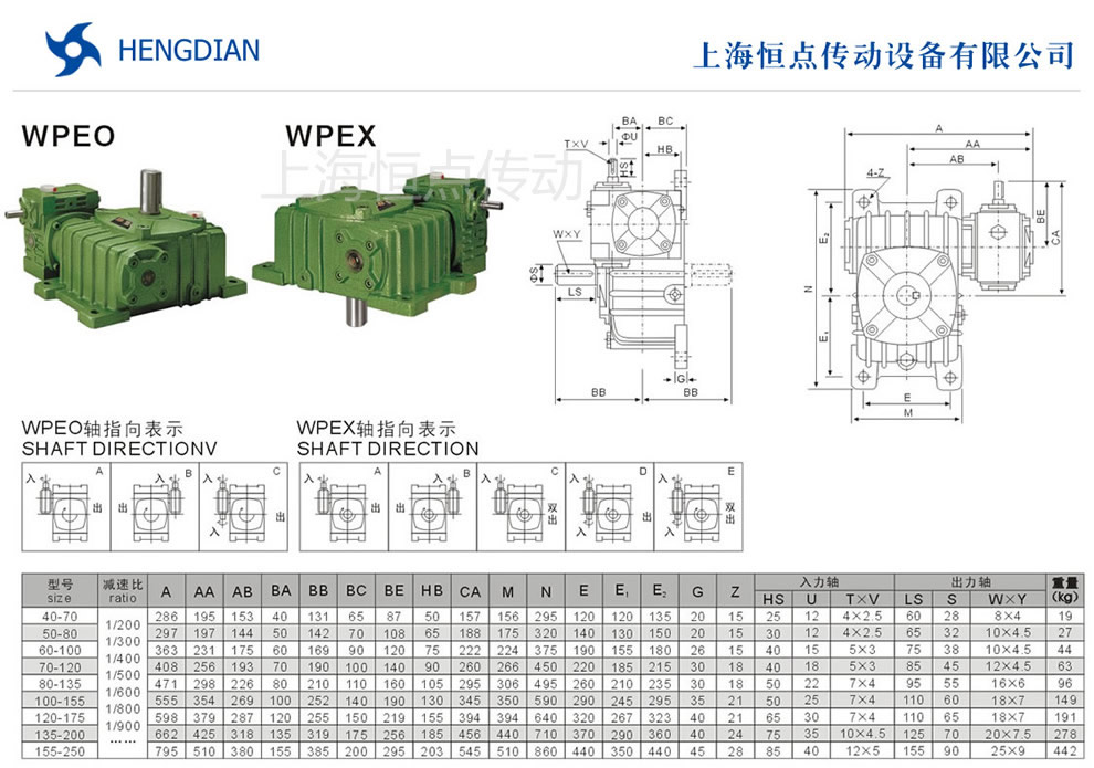 WPEO與WPEX雙級蝸輪蝸杆減速機選型指南,WPEO與WPEX雙級減速機的外形安裝尺寸.WPEO與WPEX雙級減速機軸輸入,軸輸出.WPEO與WPEX雙級減速機軸指向表示方法.機座号40-70到155-250,速比200到900